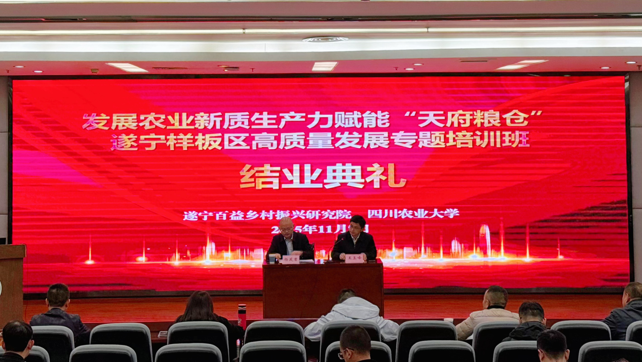 2025年11月7日,由学院承办的“发展农业新质生产力赋能‘天府粮仓’遂宁样板区高质量发展专题培训班”在四川农业大学成都校区图书馆报告厅圆满结业。遂宁百益乡村振兴研究院常务副院长杨茂君、四川农业大学管理学院副院长王玉峰教授出席结业典礼,培训班全体学员参加活动。