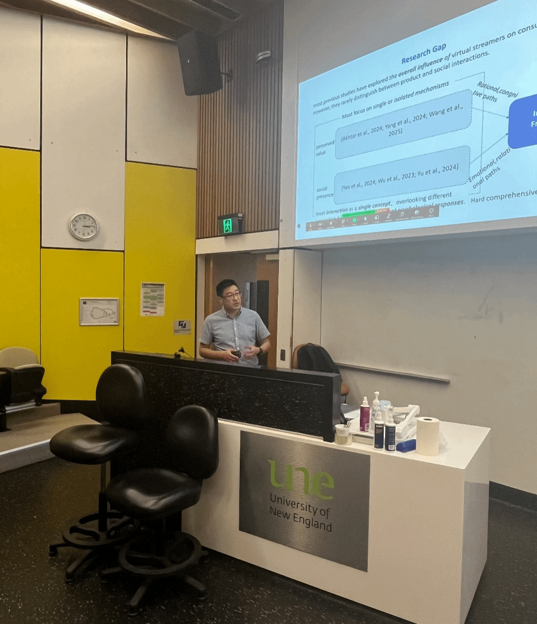 访学期间,刘浩博士参与了新英格兰大学博士论文及纽卡斯尔大学商学院博士论文调研方案评审,从理论逻辑、方法设计与学术贡献等角度提出了专业意见。受邀参加新英格兰大学“研究周”活动,并作了题为“From Virtual Streamers to Actual Purchases: Digital Retail Strategies Shaped by AI Interactions”的主题演讲,以及“Designing Scenario-Based Experiments for Consumer Behavior Research”的方法学报告。