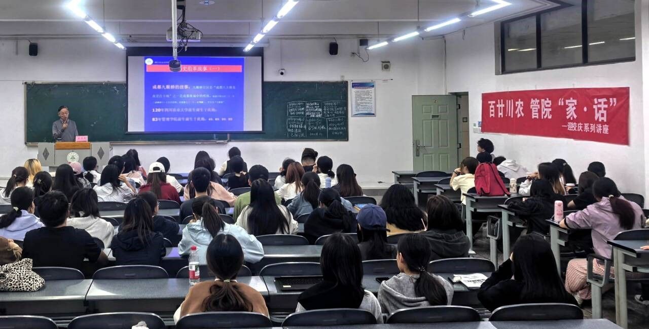 为传承弘扬“川农大精神”,迎接学校120周年校庆,管理学院全新推出“百廿川农 管院‘家·话’”迎校庆系列讲座。4月14日,系列讲座首讲在成都校区正式开讲,特邀学院原院长陈文宽教授以“我的川农情怀——讲不完的故事”为题,与师生共忆百廿校史、回溯学院发展、畅谈育人初心。