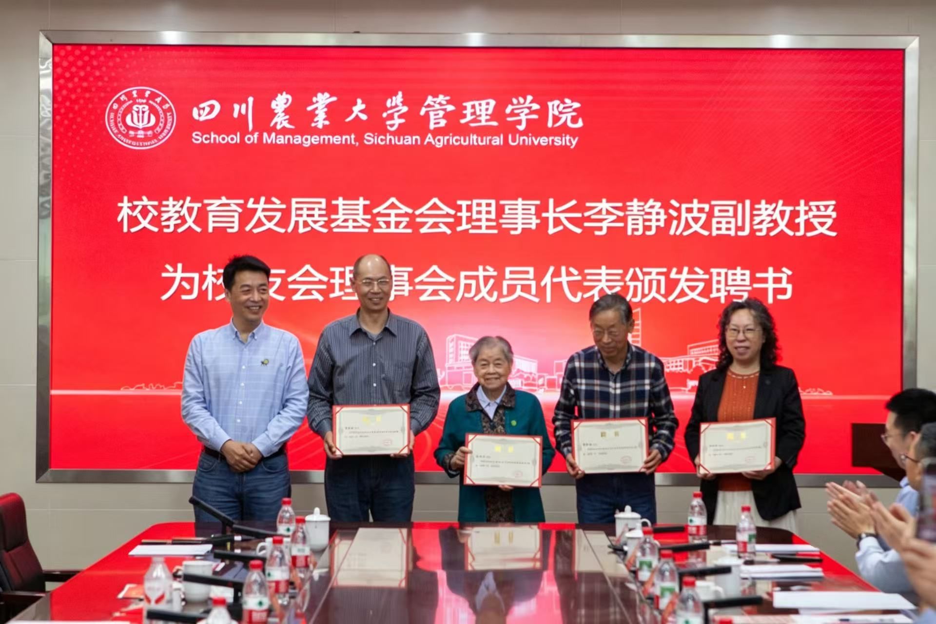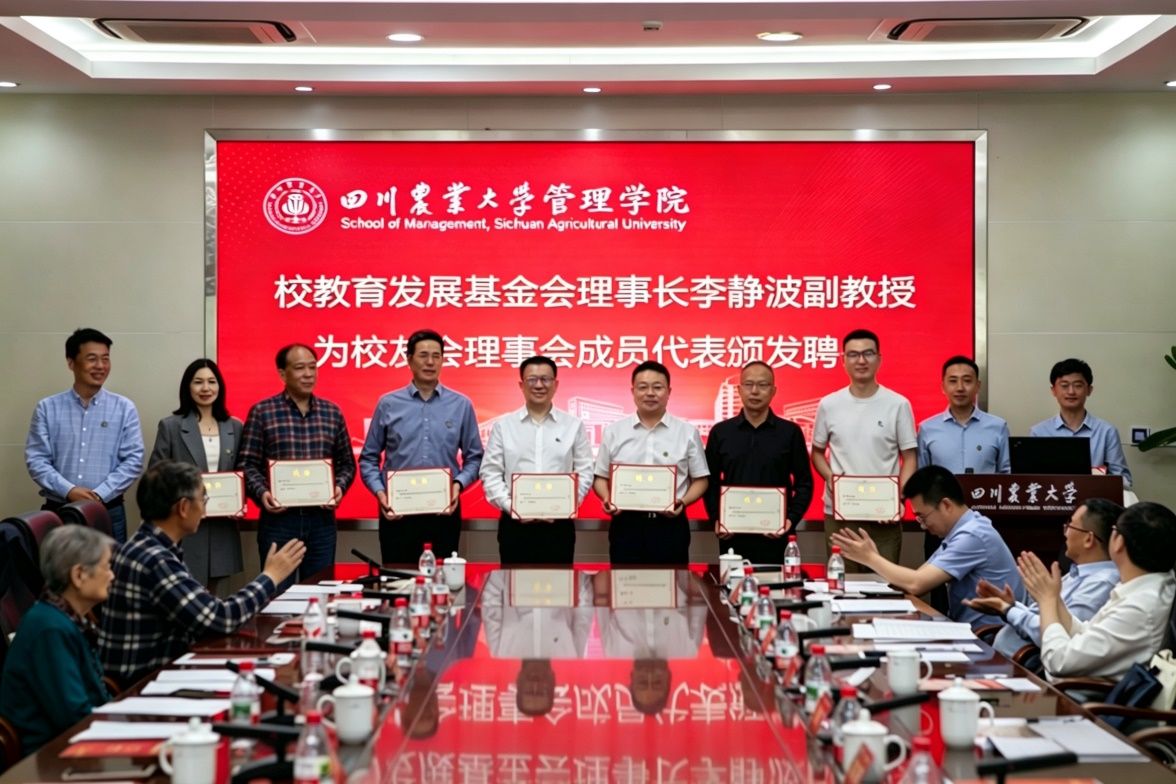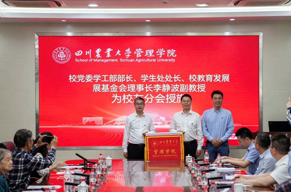 会上,李静波宣读《关于同意四川农业大学管理学院校友分会筹备成立的函》及第一届理事会人员名单。在全场热烈的掌声中,李静波为学院校友分会授旗,管理学院党委书记、校友分会会长李建强教授代表分会上台接旗,标志着校友分会正式成立。同时,李静波为校友理事会成员颁发聘书。