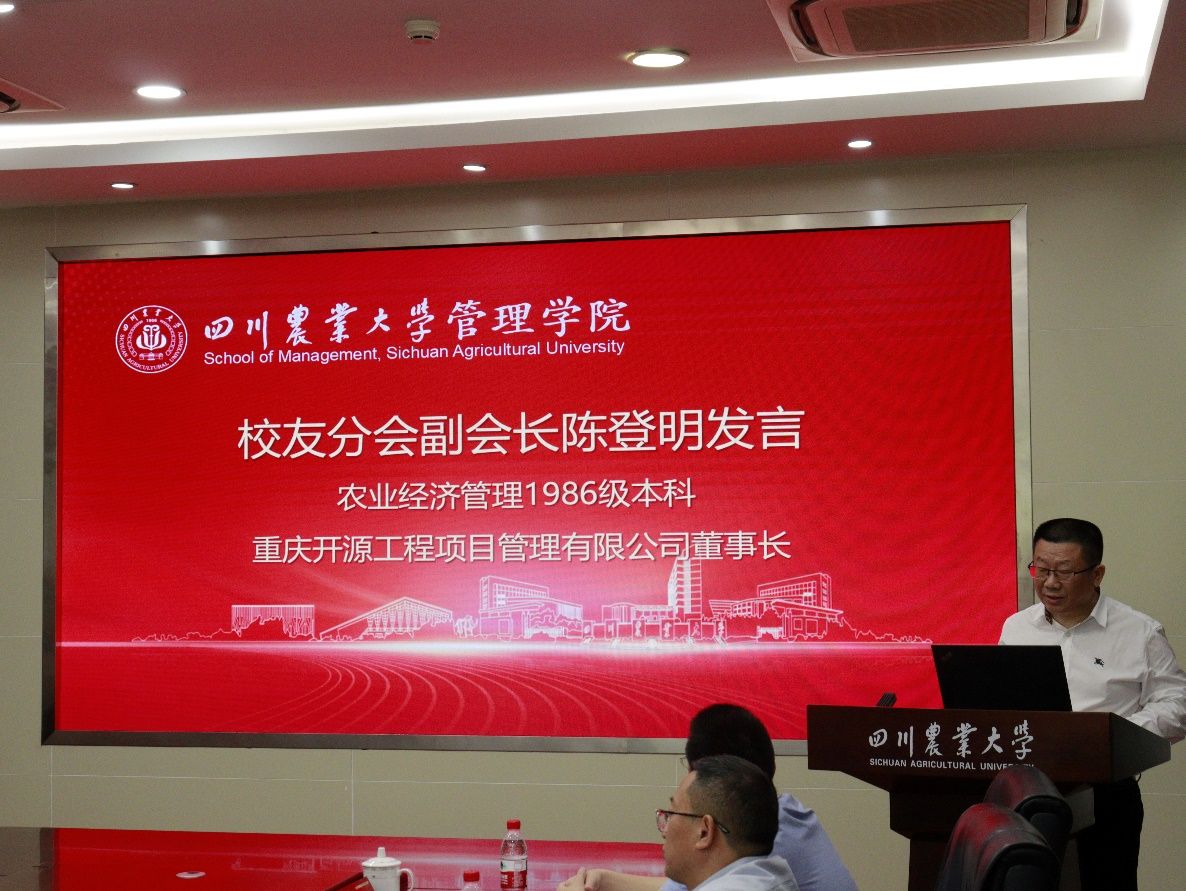 校友分会副会长、农业经济管理专业1986级校友、重庆开源工程项目管理有限公司董事长陈登明作为校友代表发言。他对管理学院校友分会成立表示热烈祝贺。他表示,校友分会的成立搭建起联络感情、汇聚力量的重要平台,校友工作将始终坚守服务母校、服务校友、服务社会的宗旨,全力配合学校 120 周年校庆工作,以实际行动感恩母校、回馈学院。