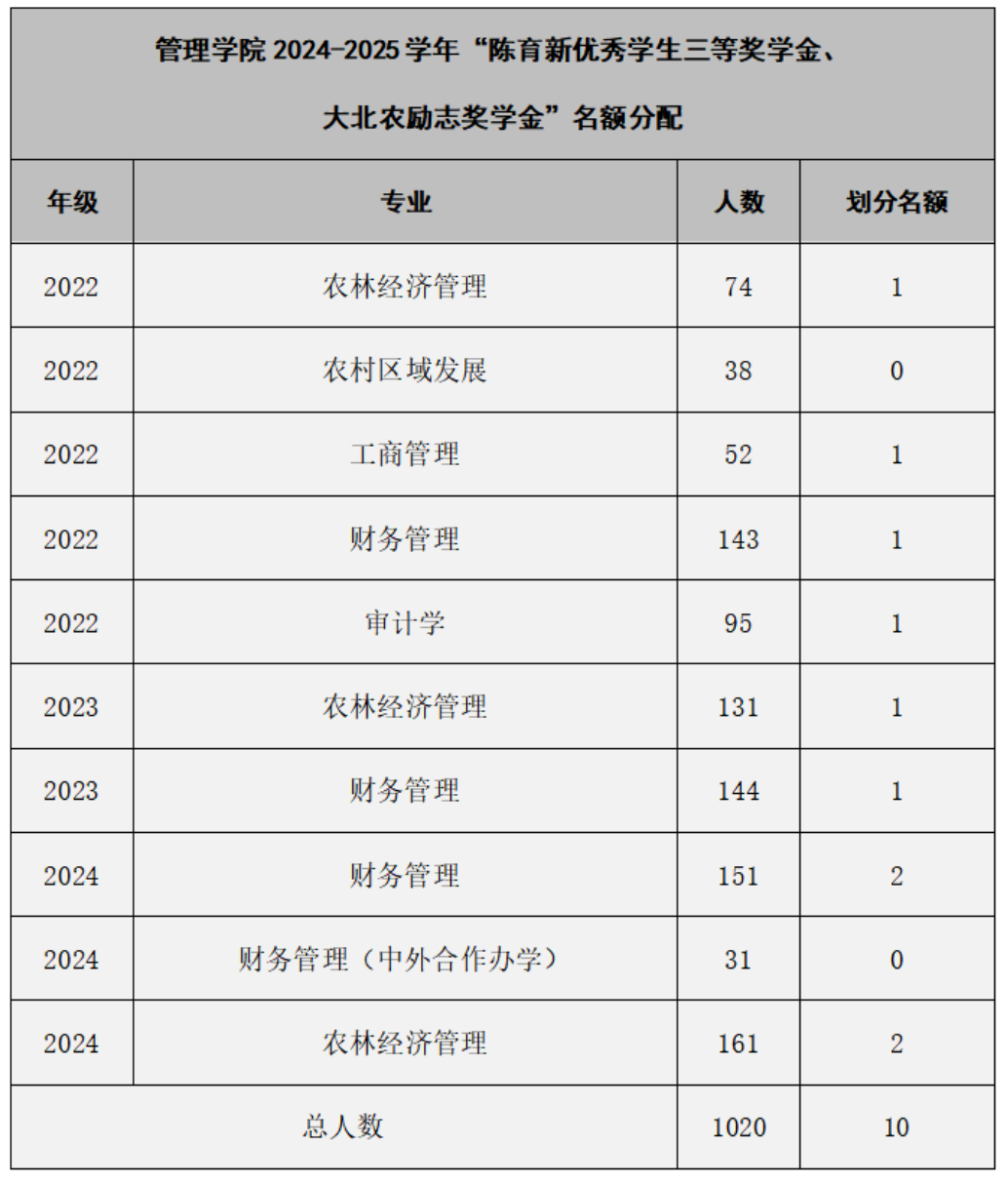 陈育新三等奖学金及大北农励志奖学金名额分配如下: