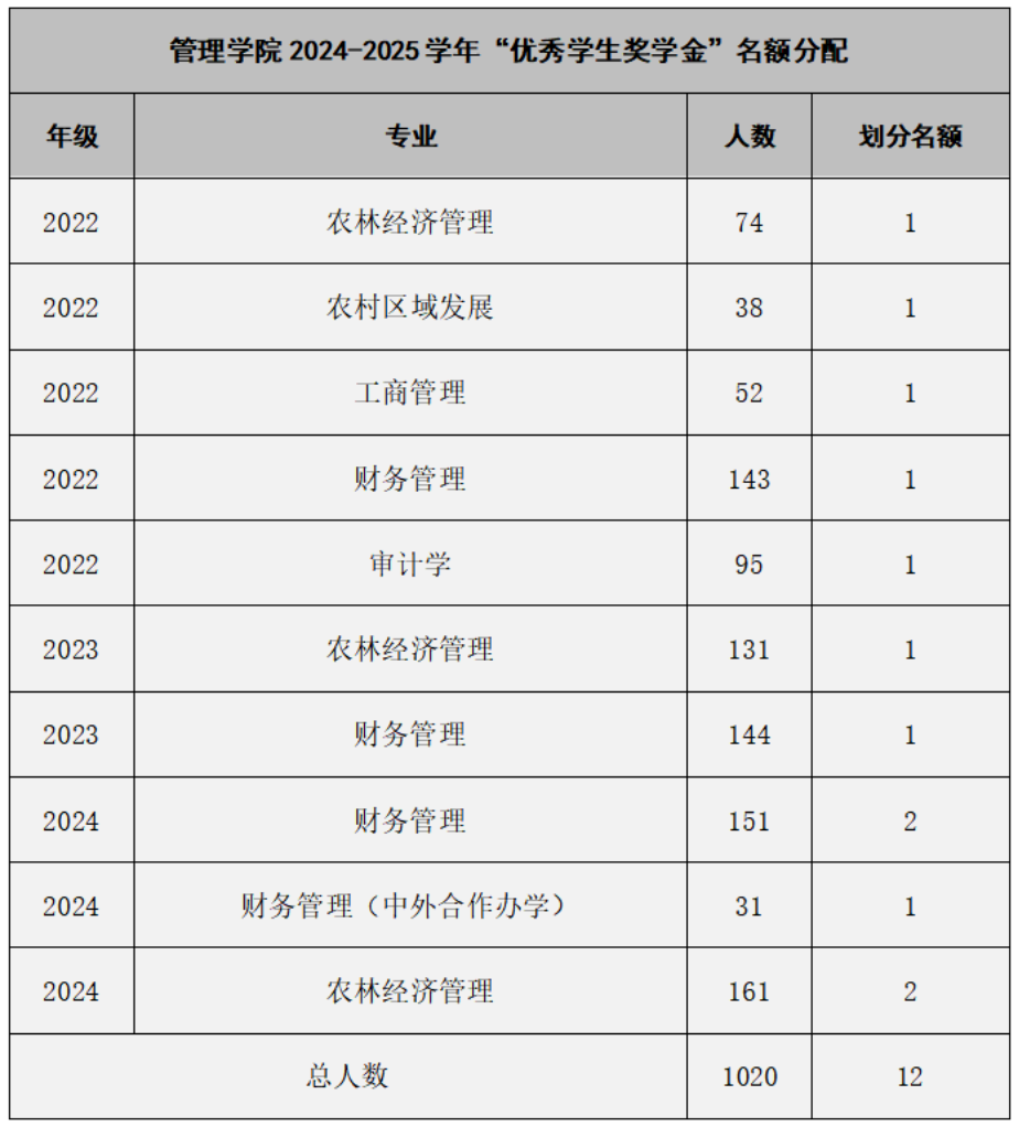小班按照评选条件推荐学生参评,优秀学生学金每小班推荐0-2名、陈育新优秀学生三等奖学金和大北农励志奖学金每小班推荐0-1名、大北农励志奖学金每小班推荐0-1名。10月12日22:00前,小班将班主任审核签字后的《管理学院2024-2025学年度奖学金推荐表》(附件1)电子档发送至邮箱3369657202@qq.com,文件命名为“班级+申请社会捐资、优生奖学金”。