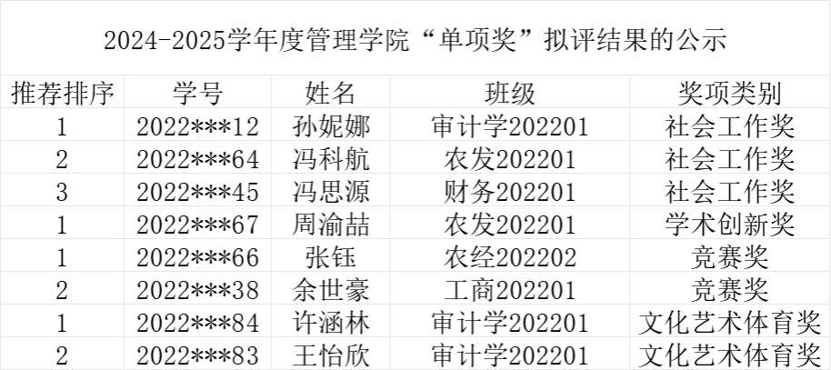 经学生本人自愿申请,学院资格审查,学院评审委员会和领导小组评审,现将2024-2025学年度“单项奖”拟评结果公示如下,“单项奖”公示期为10月21日——10月23日,若对评审结果有异议请于公示期间实名向学院党委办公室反映,电话:86290891,办公室:7-907。