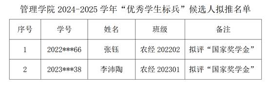 经学院在国家奖学金和优秀学生奖学金拟评人中择优推选,学院评审委员会和领导小组评审,现将2024-2025学年度“优秀学生标兵”候选人评选和推荐结果公示如下,“优秀学生标兵”候选人公示期为10月24日——10月28日(三个工作日),若对评审结果有异议请于公示期间实名向学院党委办公室反映,电话:86290891,办公室:7-907。