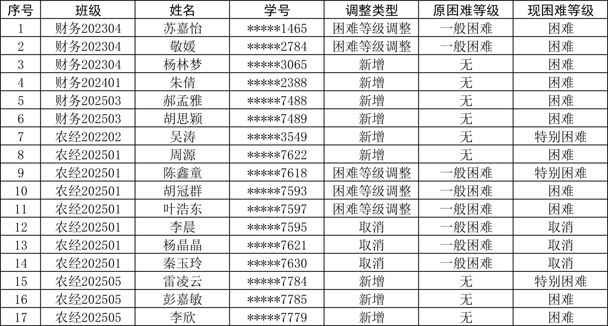 根据学校《家庭经济困难学生认定工作实施细则》,经学生本人申请,班级评议,学院督查、审核,现将2026年春季学期家庭经济困难学生认定动态调整拟定结果予以公示。